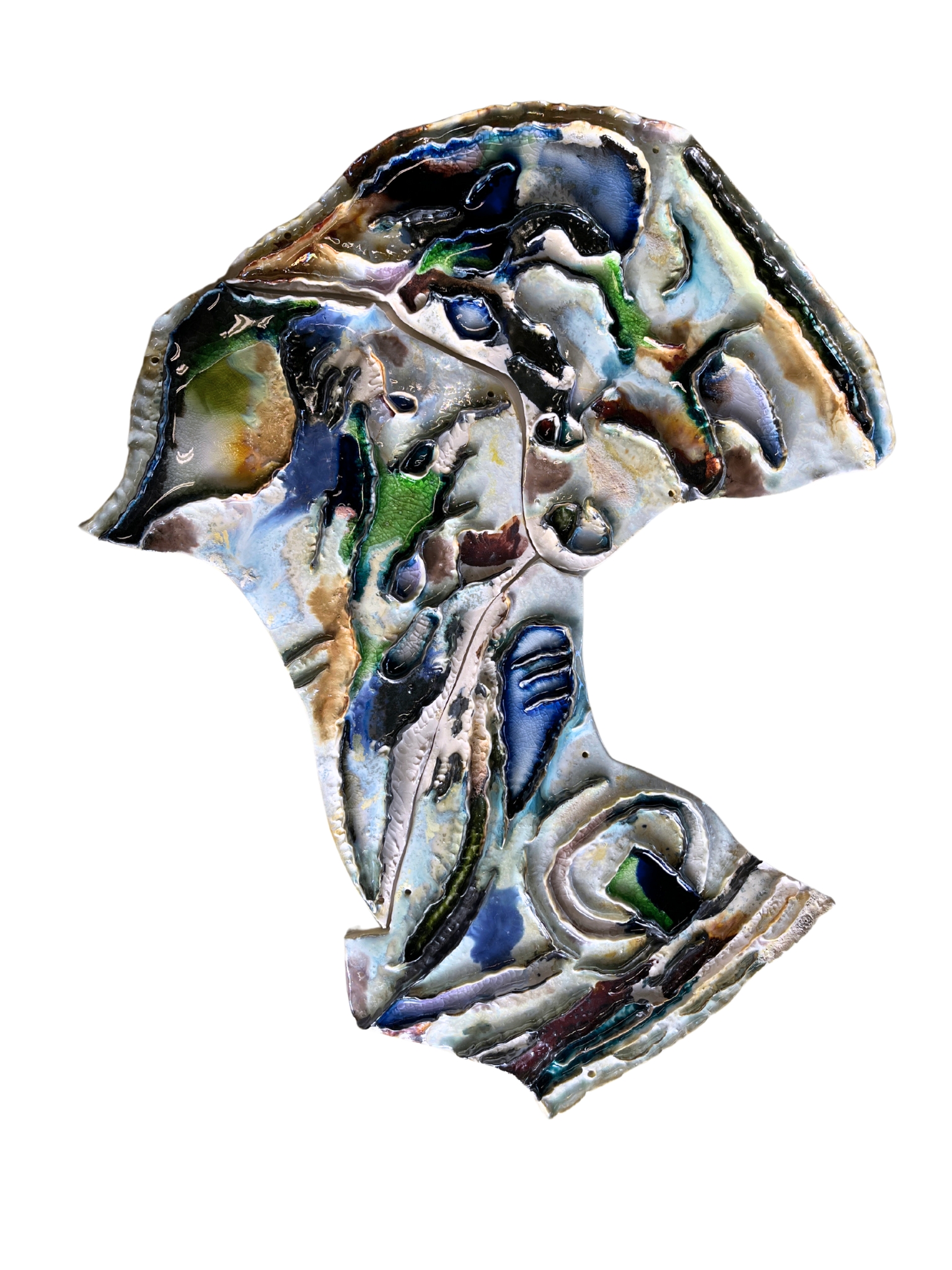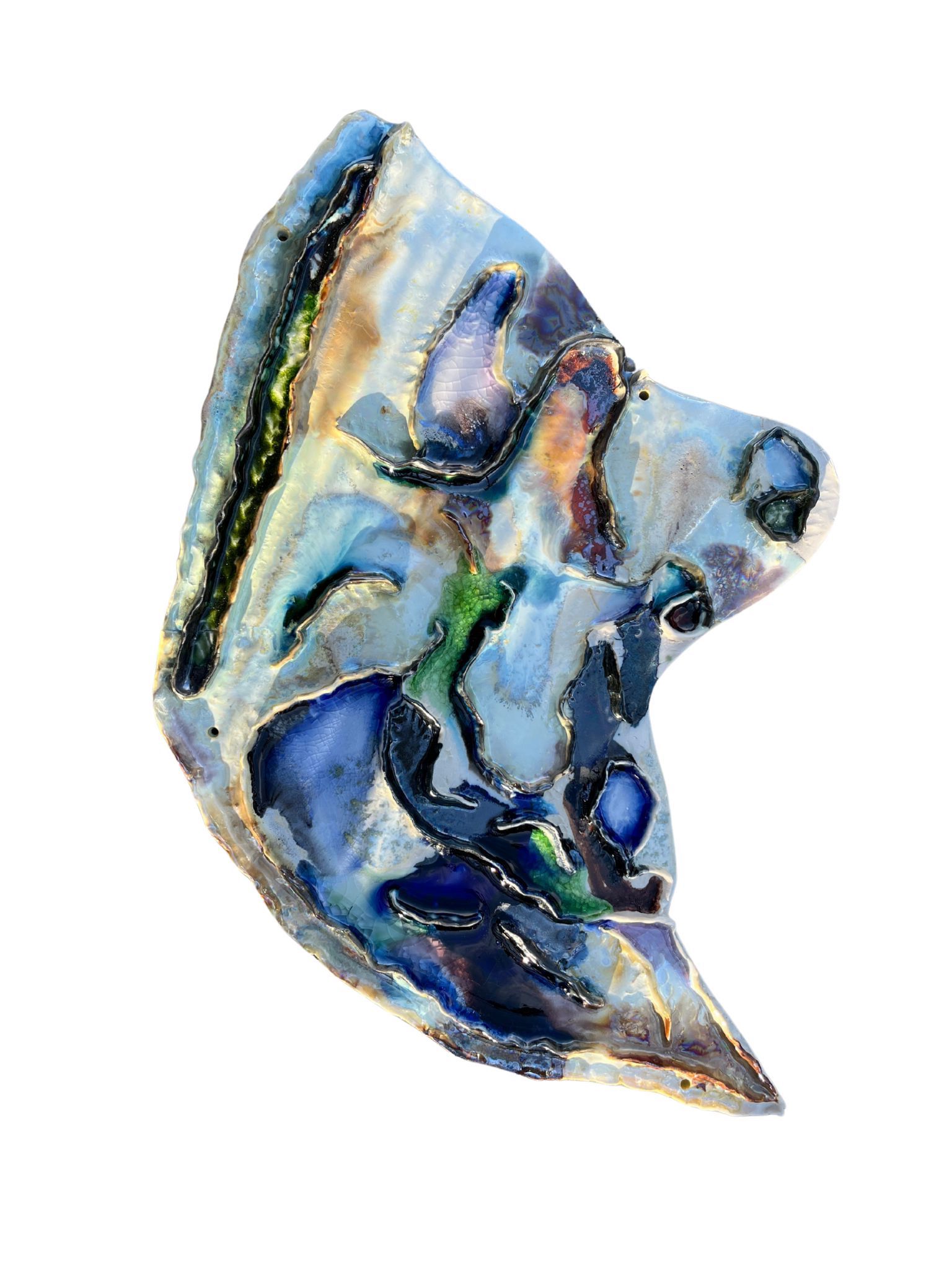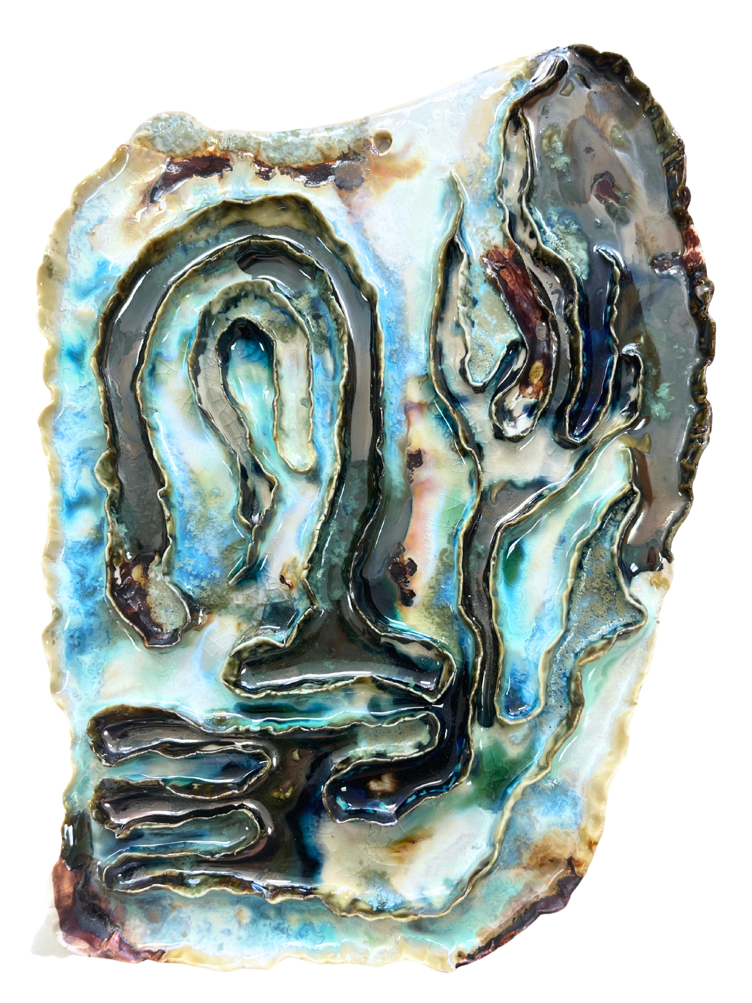 Clay, glaze, iron oxide, melted glass.