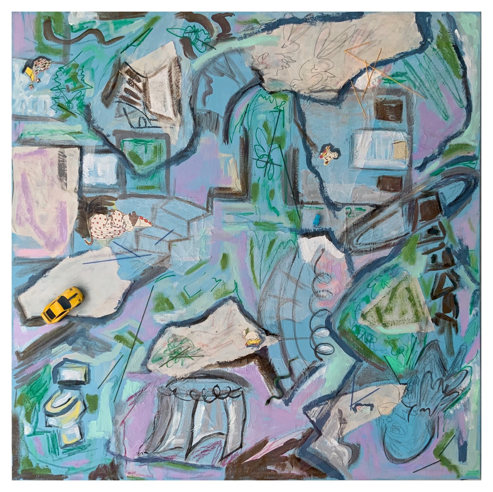 acrylic, oil, graphite, paper, 3D objects on canvas