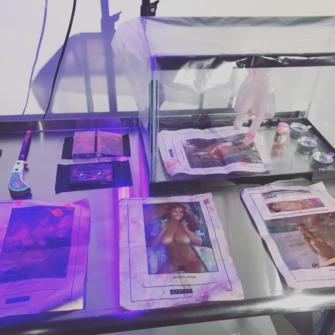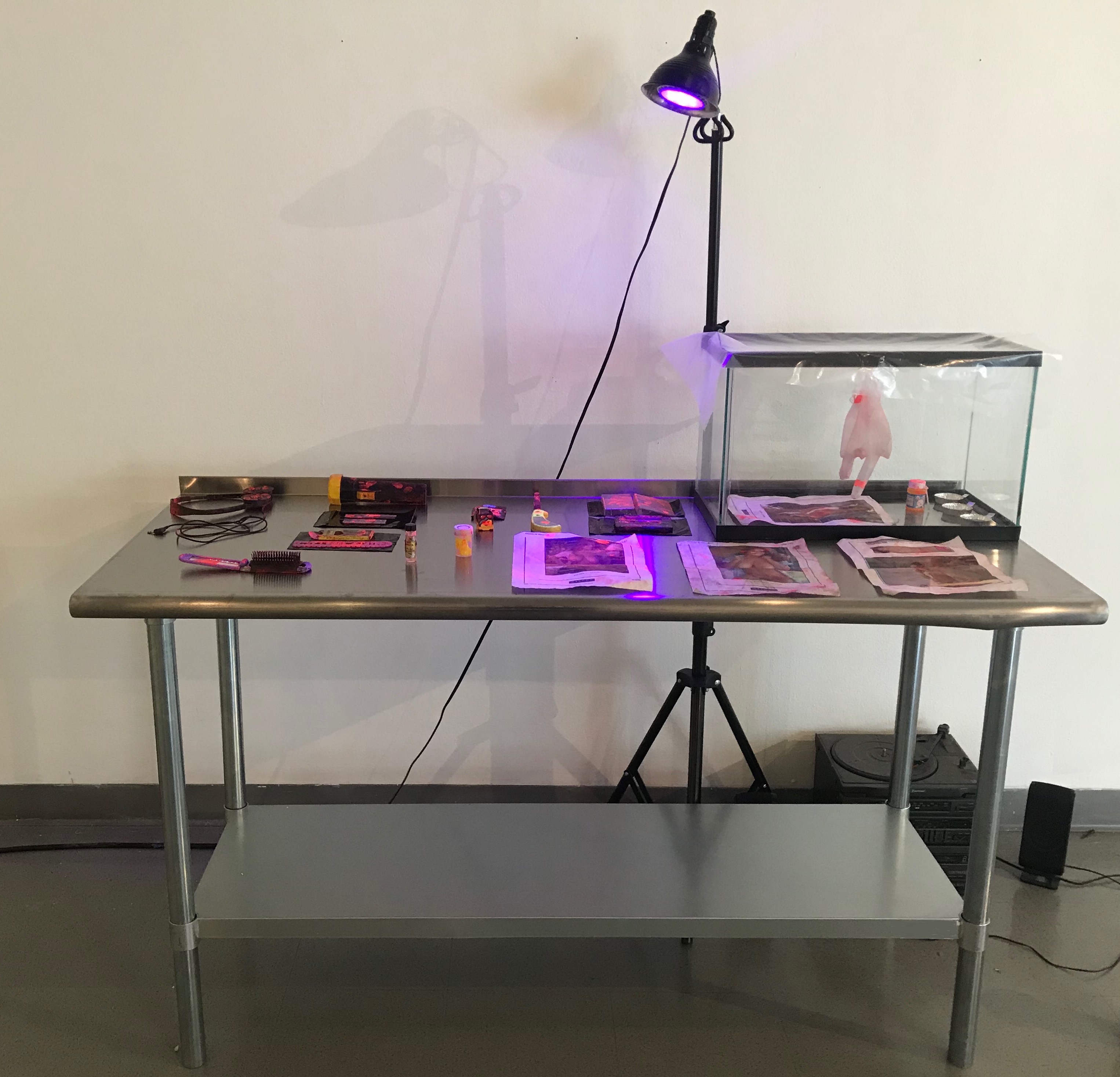 fluorescent latent print powder, UV light, fish tank, plastic wrap, Nyhidrin, alcohol, surgical gloves, table, found objects