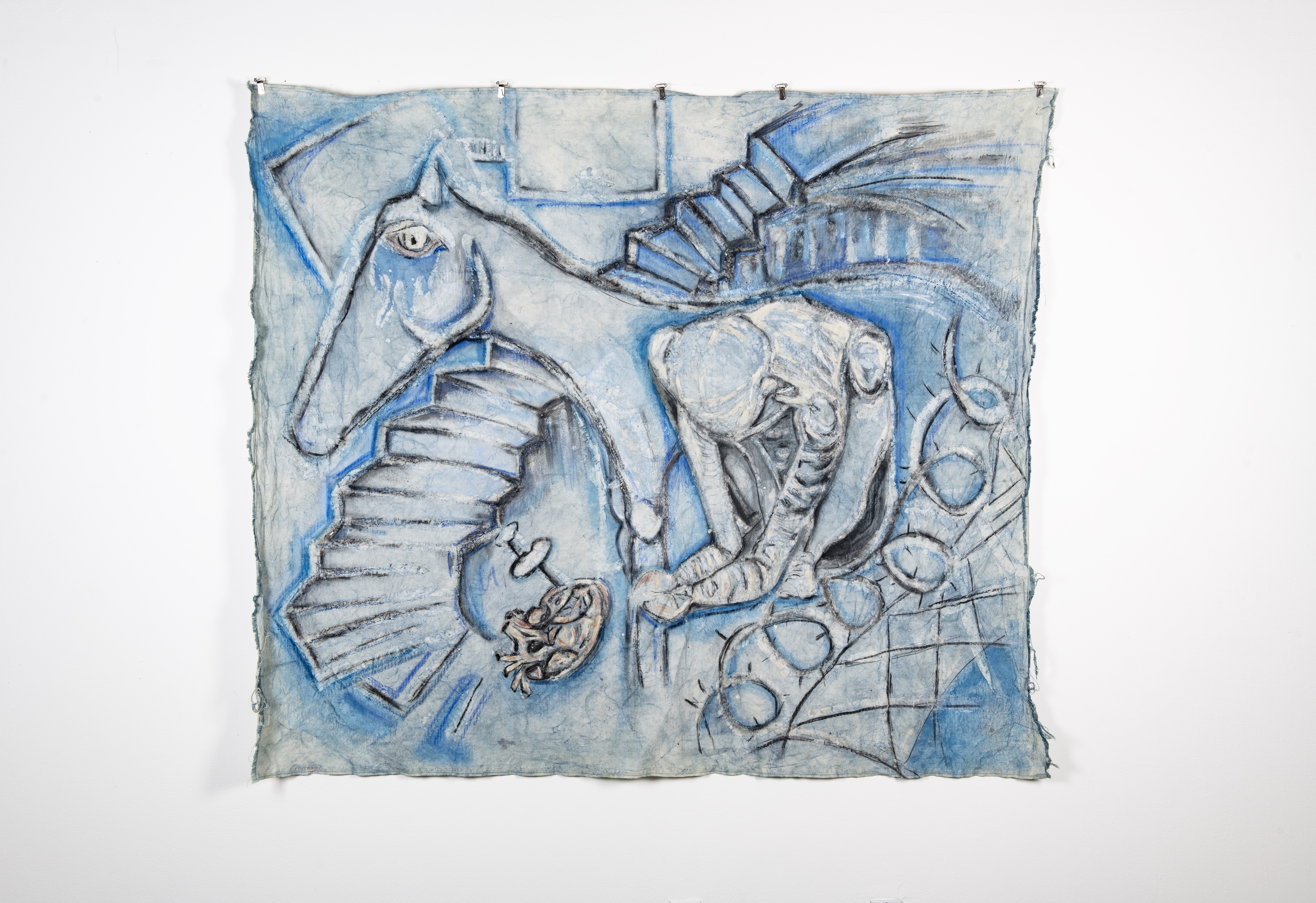 wax, charcoal, Play-Doh on dyed indigo canvas