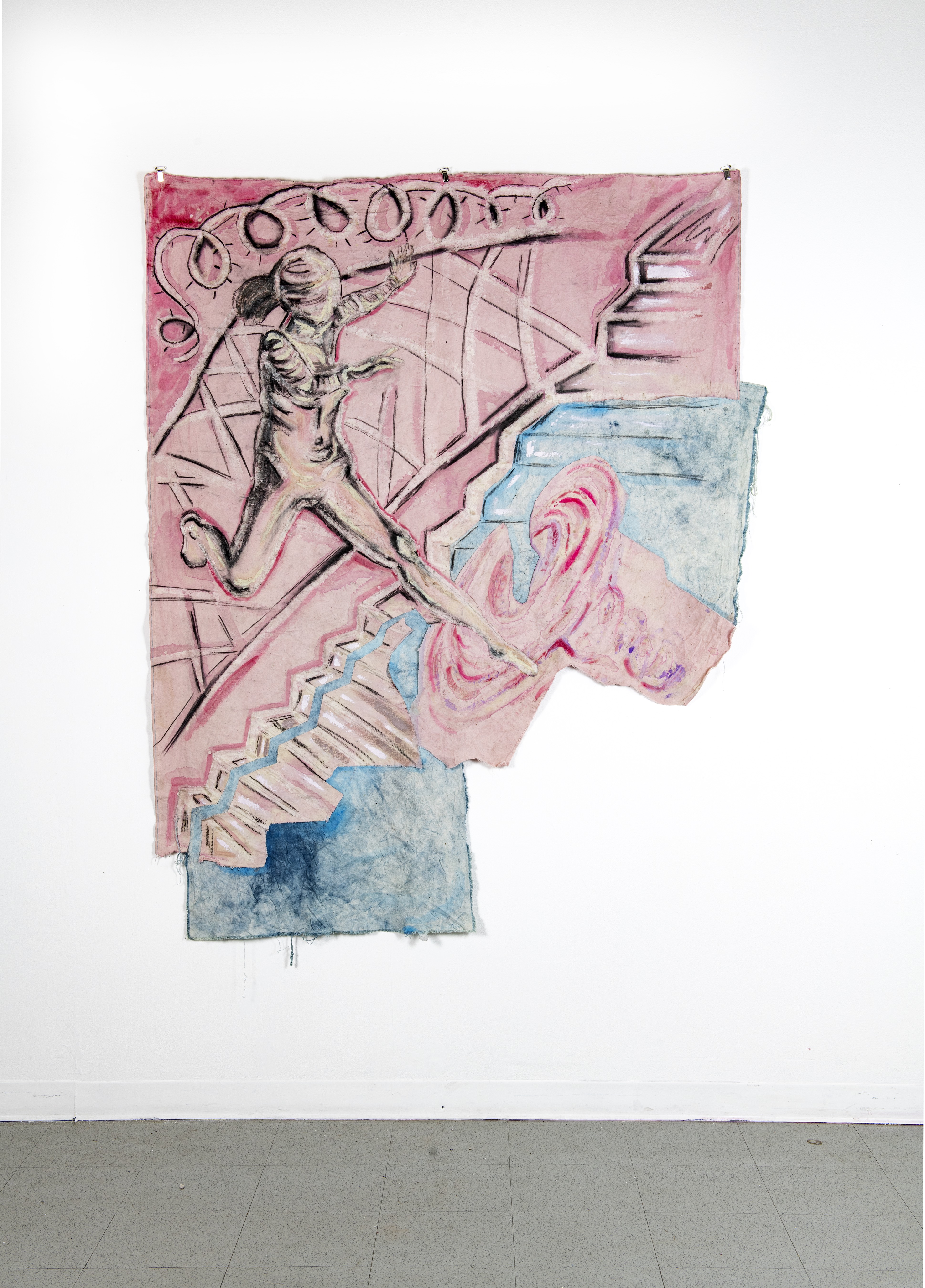 wax, charcoal, Play-Doh on canvas dyed with beet and indigo